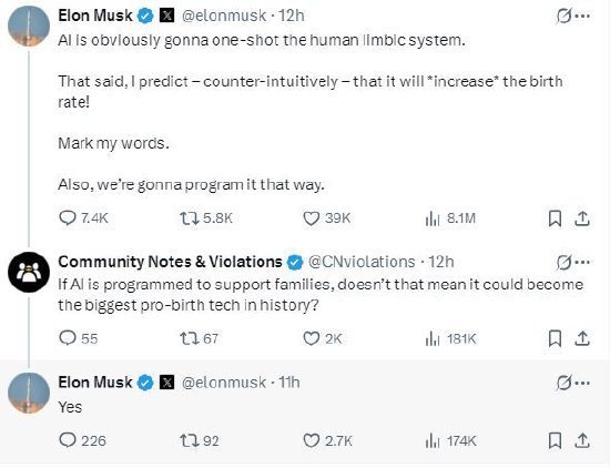 马斯克在社交平台X上发帖称:“很明显,人工智能将会打败人类的大脑边缘系统。话虽如此,我预测——与直觉相反——它将‘提高’出生率!记住我的话。同时,我们也要这样编程。”